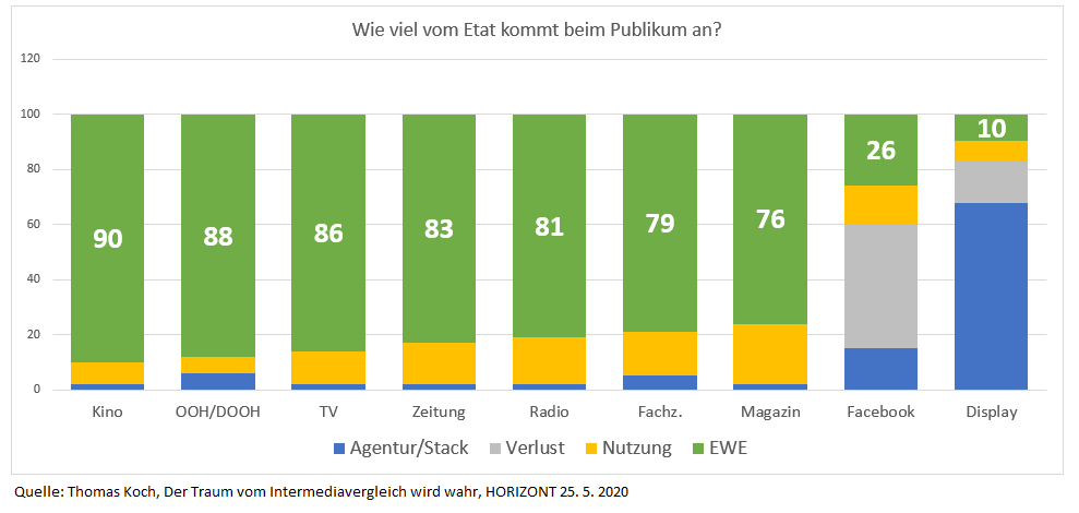 Der Etat-Werbemittel-Effizinez-Faktor von Thomas Koch – Deutschlands Mister Media – beruht auf einer recht einfachen Überlegung: wie viel vom Bruttogeld kommt denn effektiv bei einem Werbekanal und in weiterer Folge bei den Nutzern an.